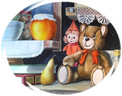 В кладовой царит сонная тишина и покой, Но, что важно, есть светлое окошко. Поэтому медвежонку и гномику не приходится сидеть в темноте. Здесь, в окружении всевозможных коробочек, ящичков и шкатулок, старых книжек сказок, фруктов и банок с разнообразными консервами и вареньем, игрушки вспоминают прежние весёлые дни, когда шумная и радостная жизнь наполняла дом. Ах, как тогда было весело! Когда день уходил на покой и ночь вступала в свои права, умаявшиеся за день детишки мирно посапывали любопытствующими носиками, а медвежонок с гномиком охраняли их сказочные сны. Да... хорошая была жизнь! А нынче игрушки скучают. Но втайне они надеются, что скоро наступит время, когда в доме появятся новые дети, и тогда о них снова вспомнят. А пока тряпичный гномик придумывает новые весёлые истории и сказки, а медвежонок поглядывает на баночку с мёдом и представляет себя самым настоящим медведем на пасеке.